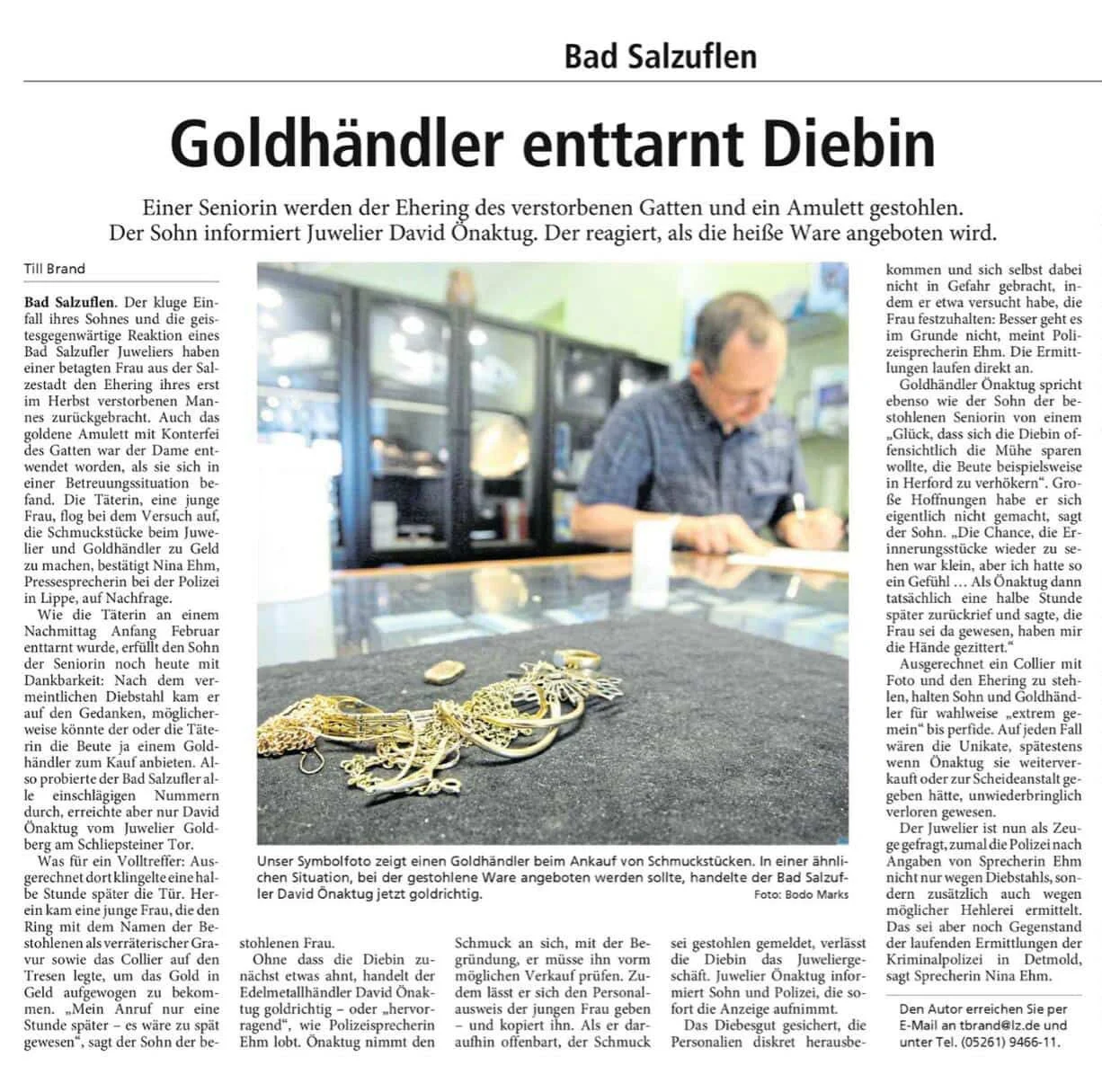 Wir sind sehr stolz darauf, dass Juwelier Goldberg bereits vielen Bürgern in Bad Salzuflen ein bekannter Begriff ist. Unser Geschäft ist jedoch dank Fernseh- und Presseberichten auch überregional bekannt und ist neben dem Goldankauf spezialisiert auf den Ankauf von Platin, Silber und Luxusuhren der Hersteller Rolex, Breitling und Omega. Selbstverständlich können Sie uns auch gerne Ihr Altgold, Zahngold, Bruchgold und andere Schmuckstücke in unser Ladengeschäft am Schliepsteiner Tor 2 in Bad Salzuflen vorbeibringen, damit wir den tagesaktuellen Wert ermitteln können. Unser fachkundiges Team berät Sie gerne und beziffert den Wert Ihrer Schätze genau um Ihnen beim Goldankauf Höchstpreise zu bieten.